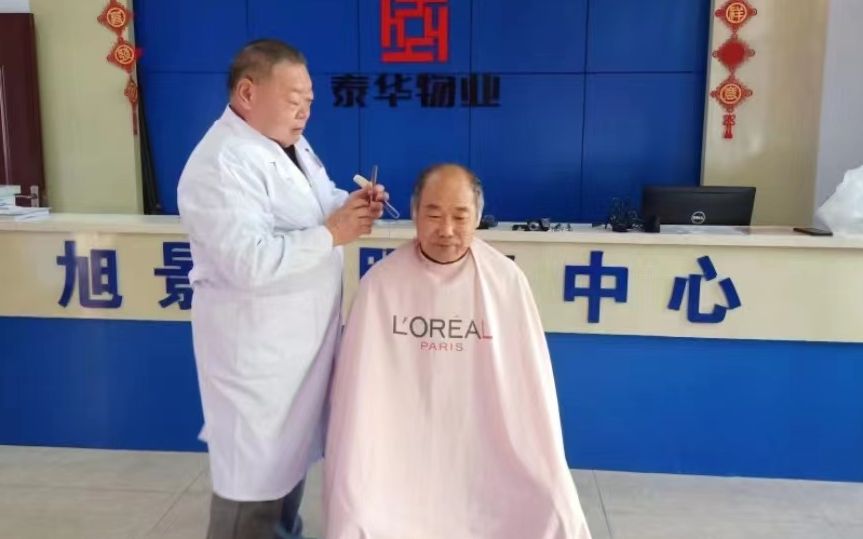 給老人理發(fā)可是個(gè)技術(shù)活,有的老人臥床不起,郝宏銀只能蹲下甚至是跪著去完成,有的養(yǎng)老機(jī)構(gòu)需要理發(fā)的人多,他一站就是一天。