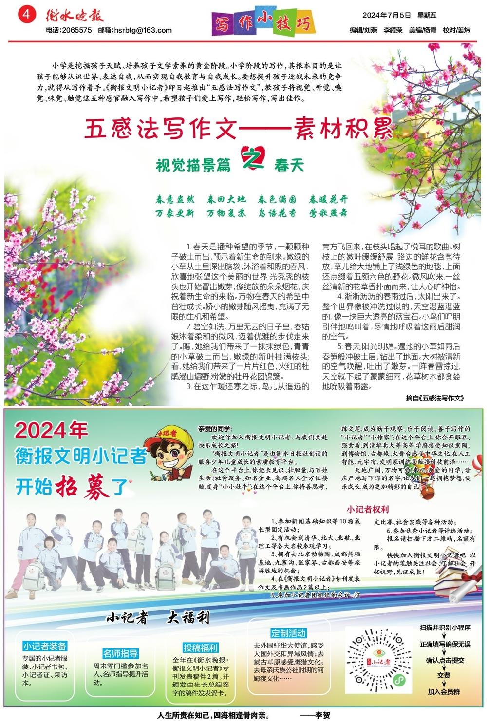 小學是挖掘孩子天賦、培養孩子文學素養的黃金階段。小學階段的寫作,其根本目的是讓孩子能夠認識世界、表達自我,從而實現自我教育與自我成長。要想提升孩子迎戰未來的競爭力,就得從寫作著手。《衡報文明小記者》即日起推出“五感法寫作文”,教孩子將視覺、聽覺、嗅覺、味覺、觸覺這五種感官融入寫作中,希望孩子們愛上寫作,輕松寫作,寫出佳作。