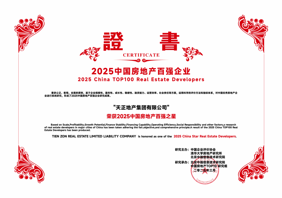 衡水天正地產集團憑借其在經營管理、財務規劃、產品交付等領域的持續鞏固,展現出強大的市場競爭力和良好的發展態勢,再次榮膺“2025中國房地產百強企業”稱號,并首度榮獲“2025中國房地產百強之星”榮譽。