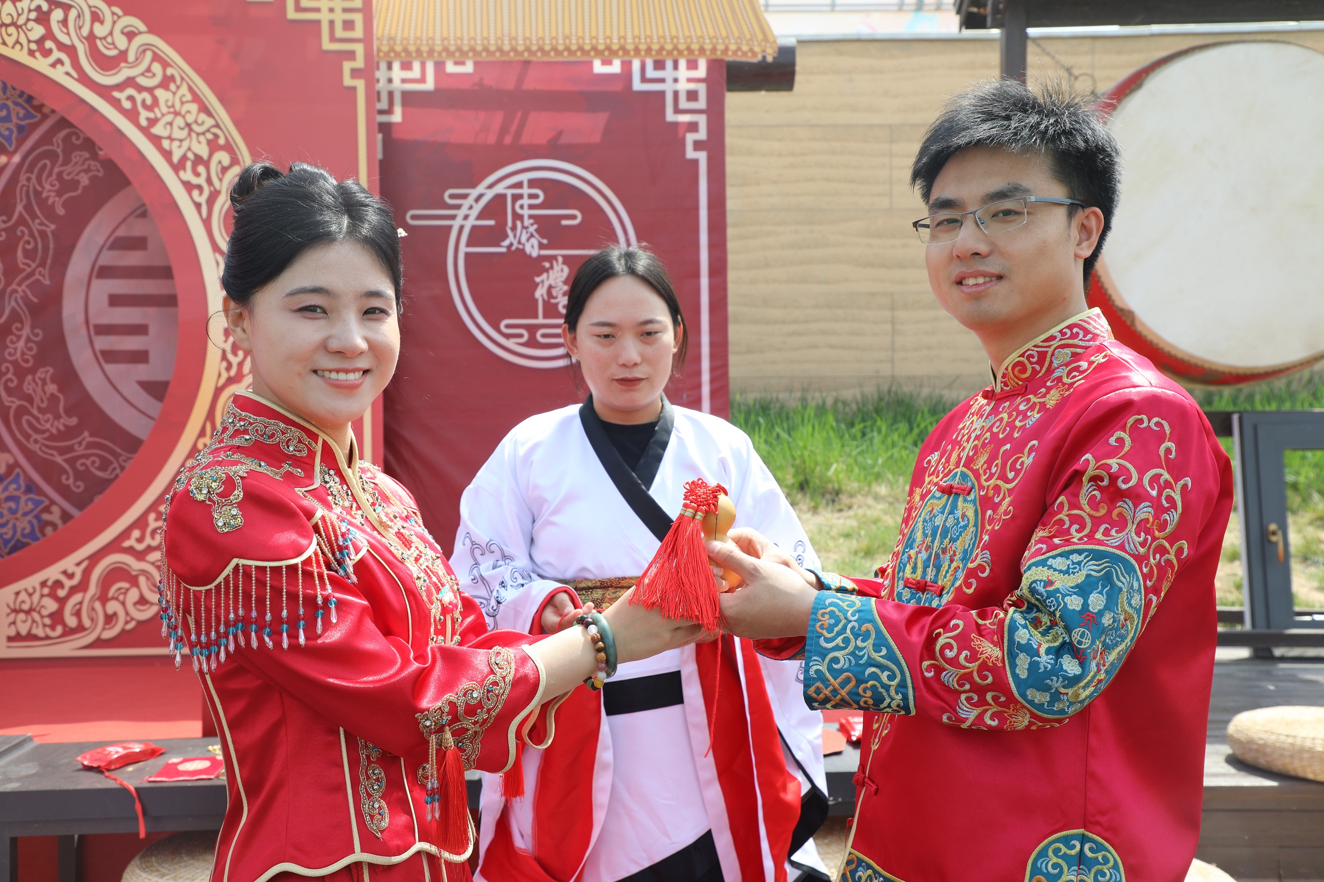 上午10 時 08分,吉時良辰。集體婚禮在悠揚的古樂聲中拉開帷幕。10對新人身著華美漢服,在司儀的引導下依次行“沃盥禮”“合巹禮”“同牢禮”等傳統(tǒng)禮儀。古城墻下,新人們的一舉一動盡顯華夏禮儀之美,千年文明與現(xiàn)代愛情在此刻交相輝映,盡顯漢代婚禮風俗的典雅風范。