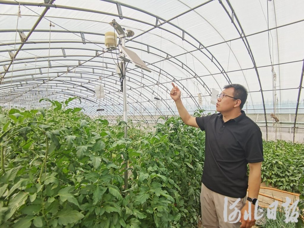 6月23日,在位于石家莊市鹿泉區大河村的省農科院大河實驗站,省農林科學院農業資源環境研究所副研究員史建碩介紹棚內的光照強度測量儀。河北日報記者 李冬云攝