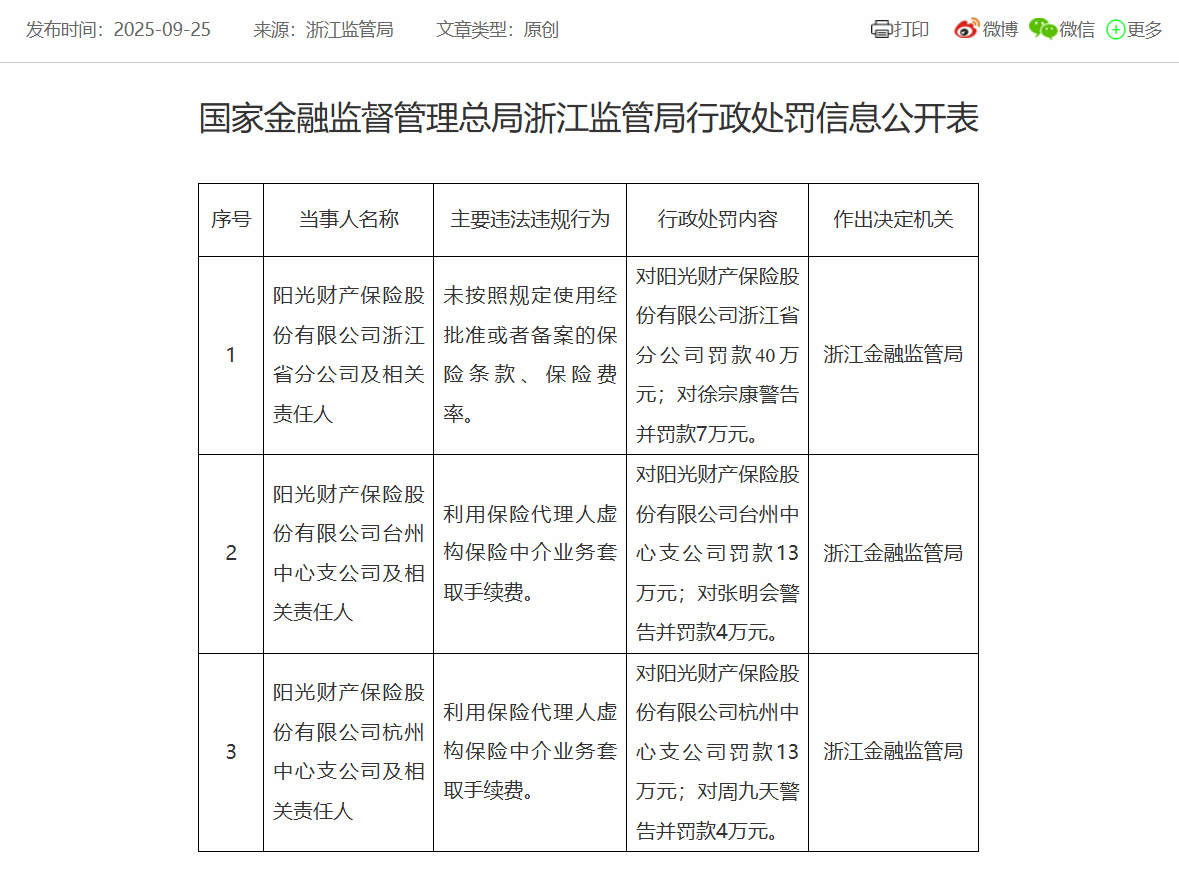 陽(yáng)光財(cái)產(chǎn)保險(xiǎn)股份有限公司浙江省分公司及相關(guān)責(zé)任人因未按照規(guī)定使用經(jīng)批準(zhǔn)或者備案的保險(xiǎn)條款、保險(xiǎn)費(fèi)率被處罰,浙江金融監(jiān)管局決定對(duì)陽(yáng)光財(cái)產(chǎn)保險(xiǎn)股份有限公司浙江省分公司罰款40萬(wàn)元;對(duì)徐宗康警告并罰款7萬(wàn)元。