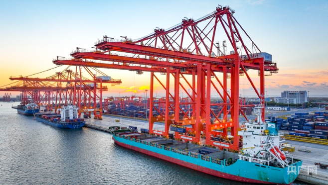 多艘貨輪停靠在碼頭裝卸貨(央廣網(wǎng)記者 李瑤 攝)