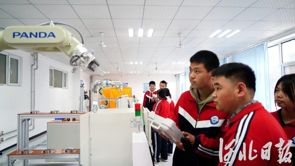 在河北臨西縣職教中心工業機器人實訓室的綜合實訓臺前,學生們正在操作完成機器人抓取、移動裝配等實訓任務。河北日報資料片