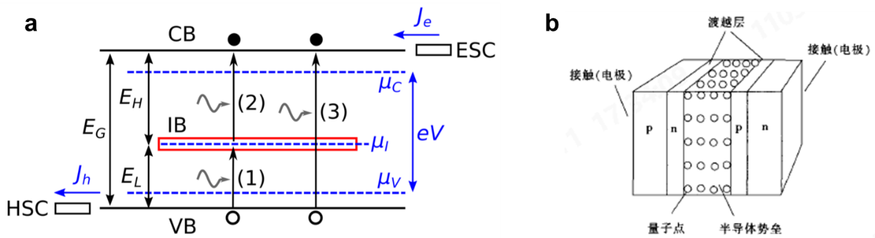 在器件設計上,IB材料通常被夾在常規p型和n型半導體間(如圖1b所示),二者作為電子和空穴的選擇性接觸層,確保電子只能從CB提取、空穴只能從VB提取,并避免IB與外部電極直接接觸,從而防止通過IB的載流子直接復合[4,5]。IB材料在此僅作為電子躍遷的中介,不直接參與載流子輸運。這種設計不僅阻斷了IB載流子的復合路徑,還使器件具備電壓保持效應,即開路電壓由總帶隙Eg決定,而非子帶隙Eh或El決定,從而實現在提升光電流的同時維持較高電壓,提高整體轉換效率。