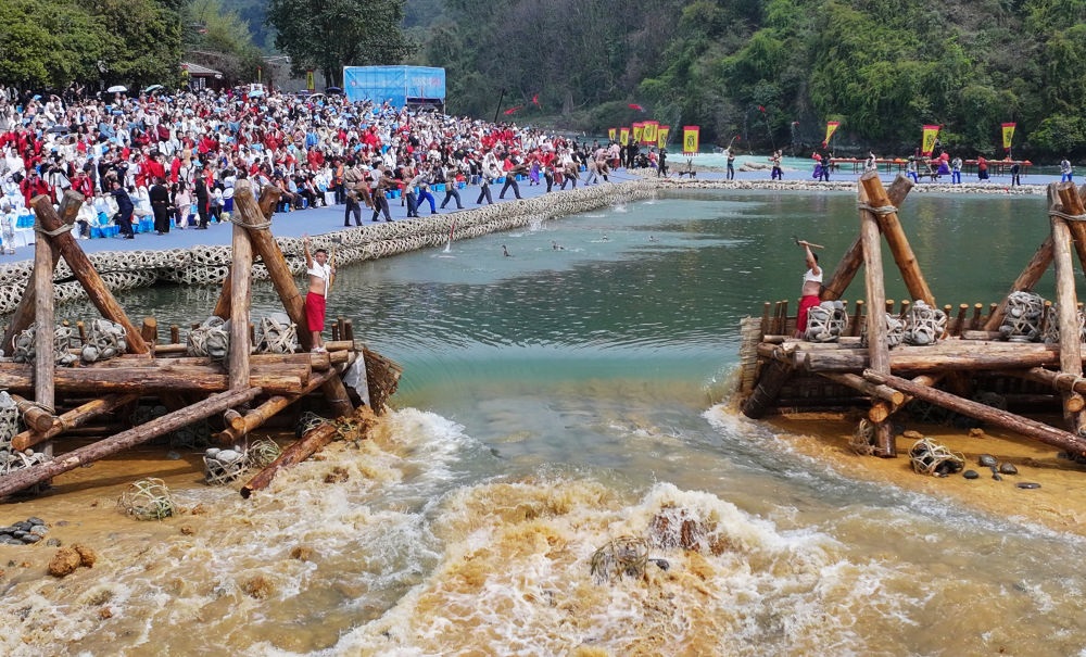 ??2025年4月4日都江堰放水節(jié),堰工砍斷榪槎的繩索后,岷江水奔流而下。新華社記者 江宏景 攝