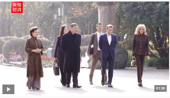 初冬的都江堰,蒼山掩翠。馬克龍夫婦抵達時,受到習近平和彭麗媛熱情迎接。兩國元首夫婦沿堰功道邊走邊談。習近平介紹都江堰歷史和意義,指出都江堰水利工程是全世界迄今唯一仍在使用的古代水利工程,也是人類與自然和諧共生最早的成功實踐之一,修建過程充分反映了中華民族自強不息、不畏艱難、勇于開拓的精神。兩國元首夫婦落座懷古亭,臨水品茗,縱論天下。