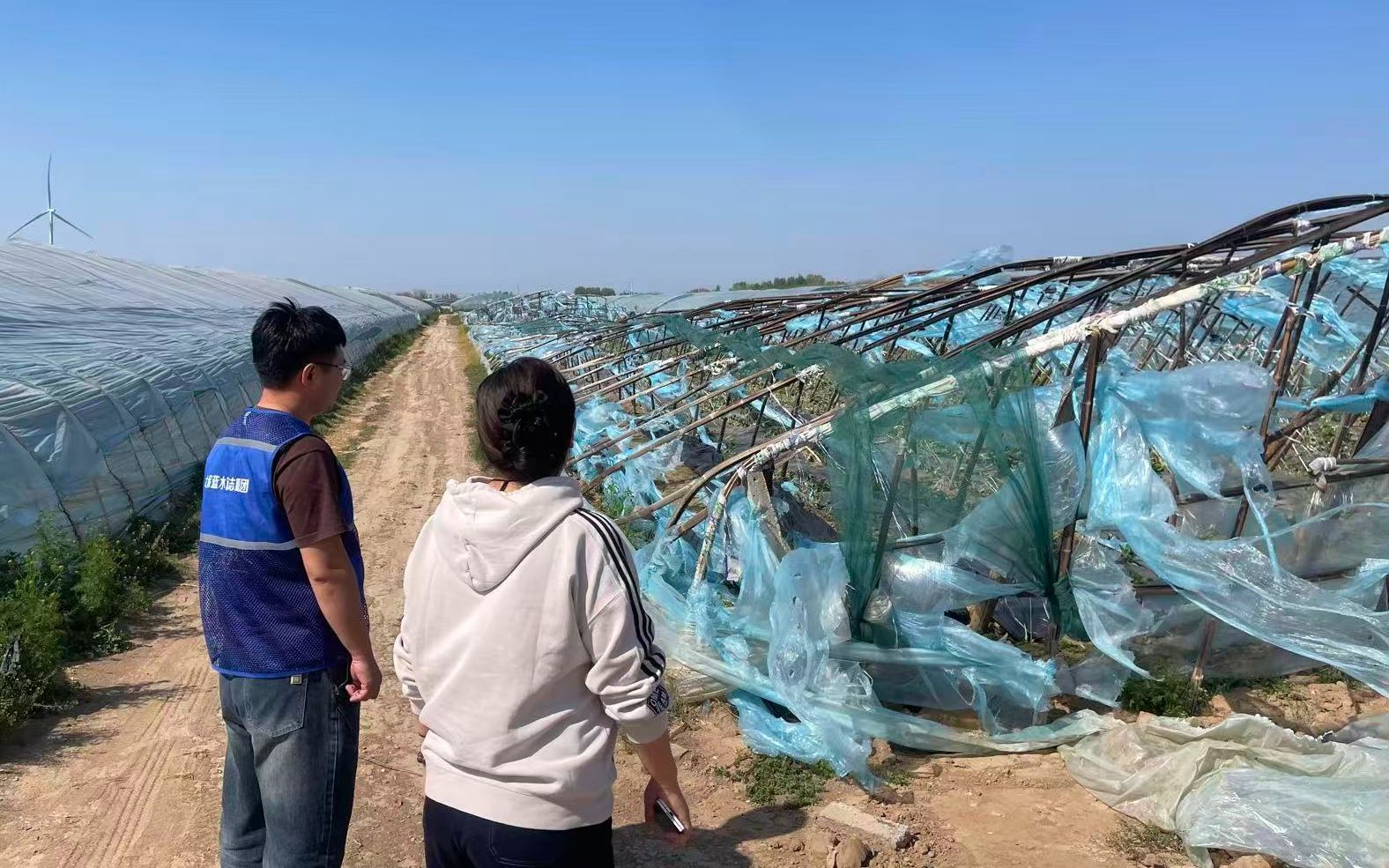 面對險情,迅速行動,查勘農戶受損大棚。