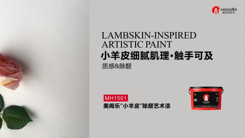 (4)MH1501“小羊皮”除醛藝術漆,較強的小羊皮紋理質感,市面目前既有小羊皮質感,又可以除甲醛的藝術漆,目前德國美閣樂是已知的唯一有此產品的品牌;零異味,零甲醛,除甲醛,除醛率≥96%,持久性≥90%,適合有高端質感墻面需求,又想要環保家庭裝修墻面使用;