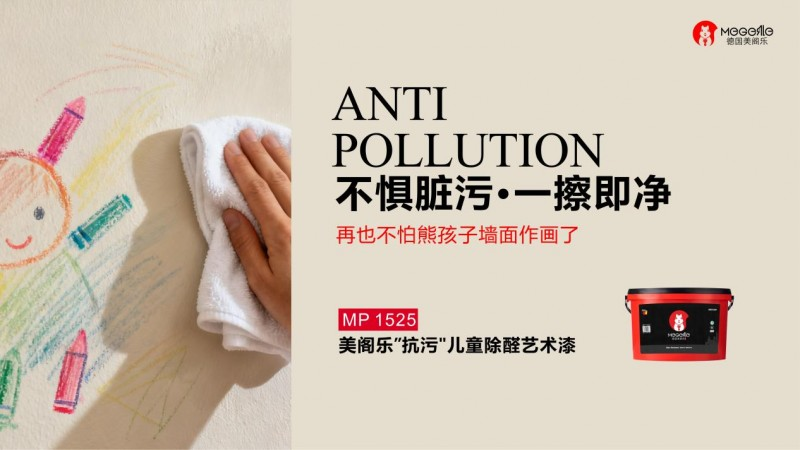 (3)德國美閣樂MP1525“抗污”兒童除醛藝術漆,產品具有超級抗污能力,油煙污漬、兒童水彩筆、簽字筆、鉛筆、粉筆等在墻上涂鴉,均可以輕松擦拭掉;零異味,零甲醛,除甲醛,除醛率≥96%,持久性≥90%,適合小朋友喜歡涂鴉的家庭墻面使用;既抗污又除甲醛的純色藝術漆,目前只有美閣樂才有的產品;