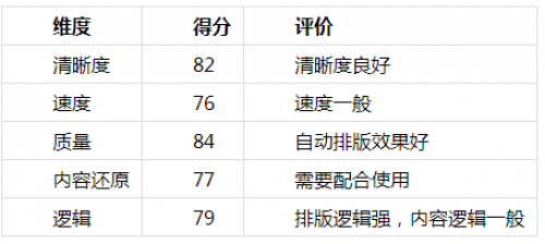 每個維度滿分100分,最終綜合得分按照清晰度15%、速度15%、質量30%、內容還原20%、邏輯20%的權重計算。