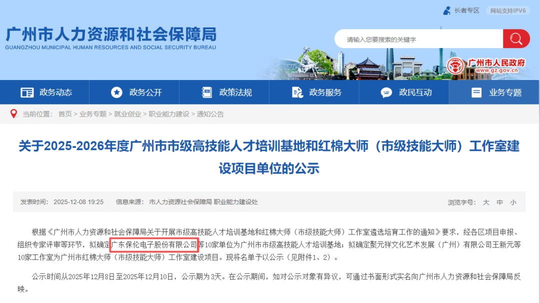 近日,廣州市人力資源和社會保障局正式發布了《關于2025-2026年度廣州市市級高技能人才培訓基地和紅棉大師(市級技能大師)工作室建設項目單位的公示》。在激烈的競爭中, itc保倫股份憑借在音視頻領域深厚的技術積累與豐富的產業實踐,成功入選 “廣州市市級高技能人才培訓基地”,標志著itc在產教融合與技能人才培訓領域邁入規范化、示范化發展的新階段。